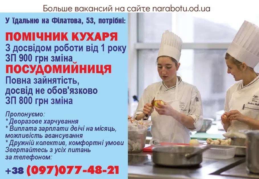 У їдальню на Філатова, 53, потрібна на постійну роботу, Повна зайнятість, досвід не обов'язково. ЗП 800 грн зміна. Пропонуємо: * Дворазове харчування * Виплата зарплати …