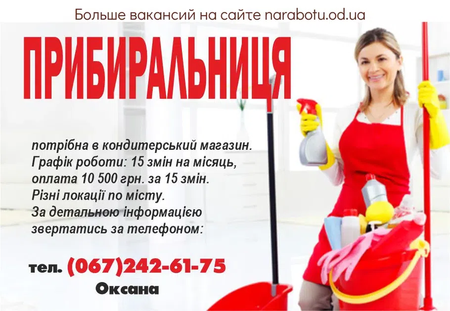 Потрібна на постійну роботу, Район вулиця Середня (Бугаївська). Графік 2 рази на тиждень середа та четвер, з 15.00 до 20.00. Звертатися за телефоном: Повідомте, будь …