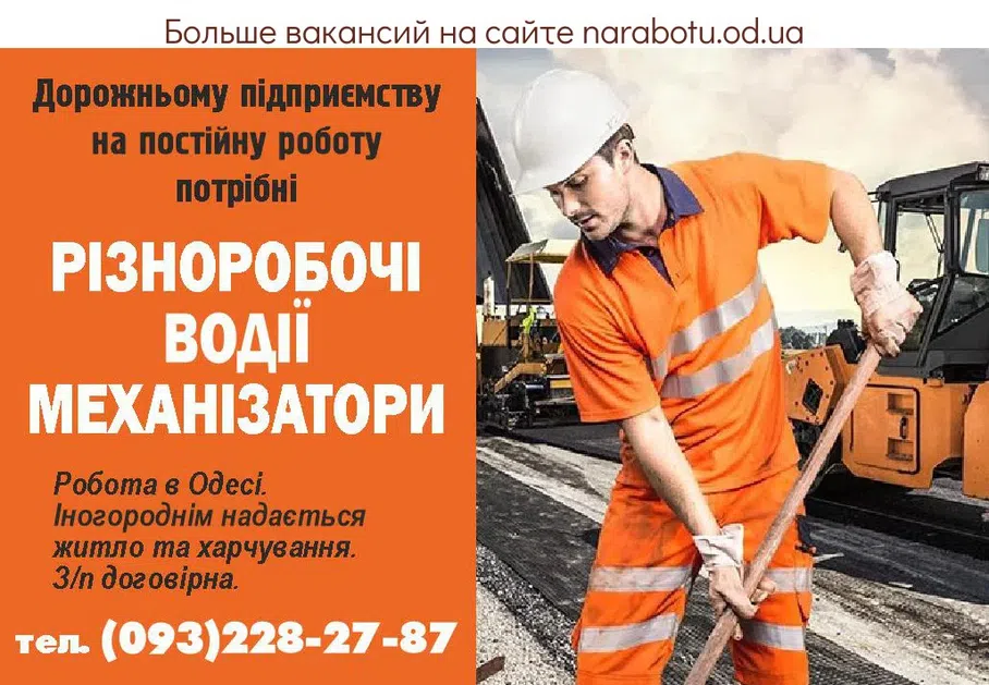 потрібні дорожньому підприємству на постійнуї роботу. Робота в Одесі. Іногороднім надається житло та харчування. З/п договірна. Повідомте, будь ласка, роботодавцю, що Ви прочитали вакансію на …