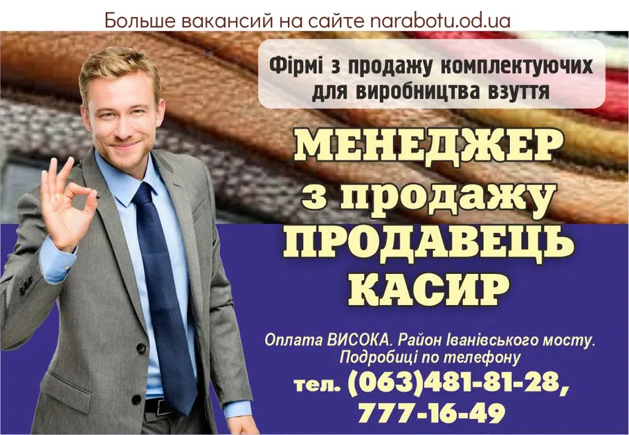 Фірмі з продажу комплектуючих для взуття, на постійну роботу терміново потрібні: Оплата ВИСОКА. Район Іванівського мосту. Подробиці по телефону Повідомте, будь ласка, роботодавцю, що Ви …