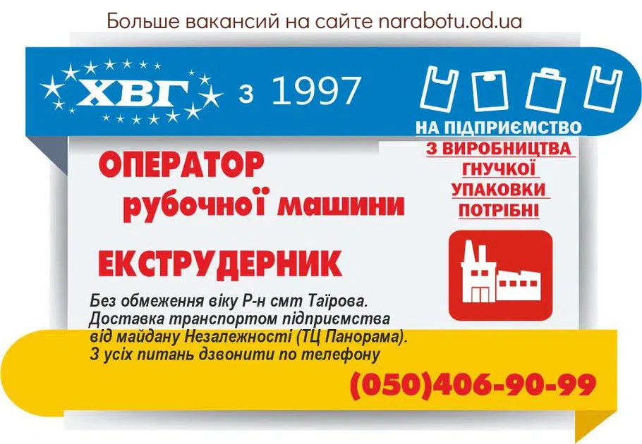 потрібен на підприємство з виробництва гнучкої упаковки. Можна без досвіду роботи, навчання на місці. Р-н смт Таїрова. Доставка на/з роботи від пл. Незалежності транспортом підприємства. …