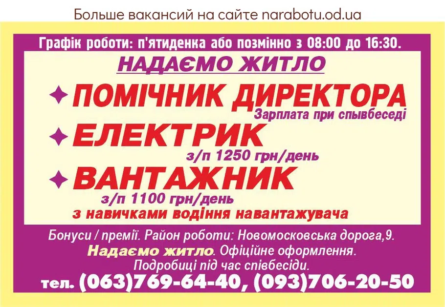 РОБОТА З ПРОЖИВАННЯМ І ОПЛАТОЮ ПРОЇЗДУ! Подробиці по телефону: Повідомте, будь ласка, роботодавцю, що Ви прочитали вакансію на сайті narabotu.od.ua
