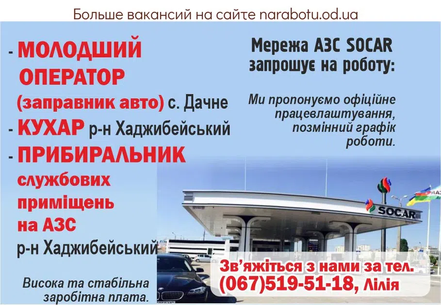 Мережа АЗС SOCAR запрошує на роботу * р-н Хаджибейський. Ми пропонуємо офіційне працевлаштування, змінний графік роботи. Висока та стабільна заробітна плата. Зв'яжіться з нами за …