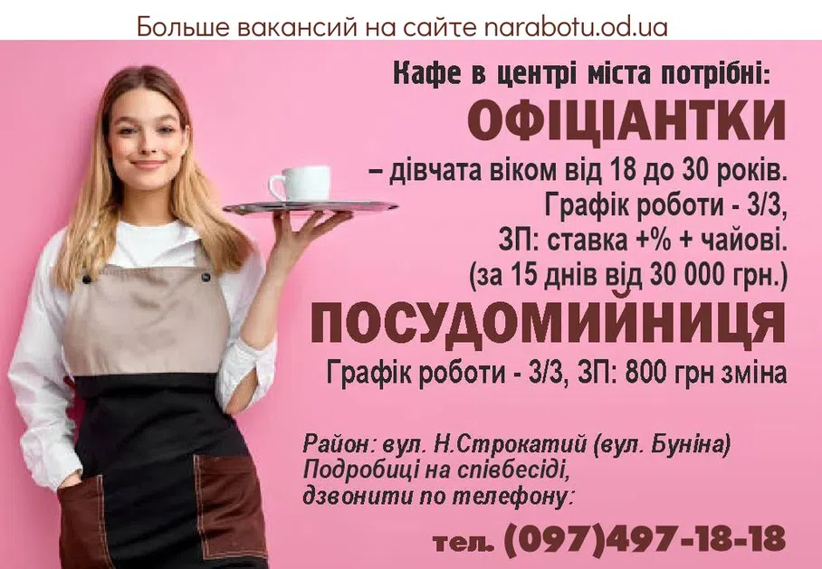 До ресторану з літнім майданчиком (Приморський район) потрібні: зарплата % + чайові. ТЕЛЕФОНУВАТИ в робочі дні з 9.00 до 16.00 Повідомте, будь ласка, роботодавцю, що …