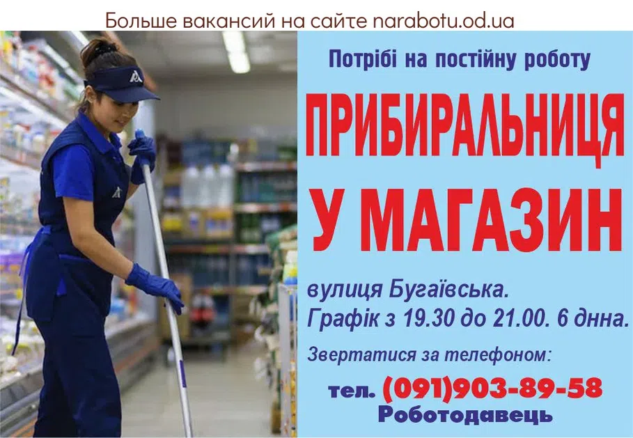 Потрібна на постійну роботу , вулиця Бугаївська. Графік з 19.30 до 21.00. 6 днна. Звертатися за телефоном: Повідомте, будь ласка, роботодавцю, що Ви прочитали вакансію …