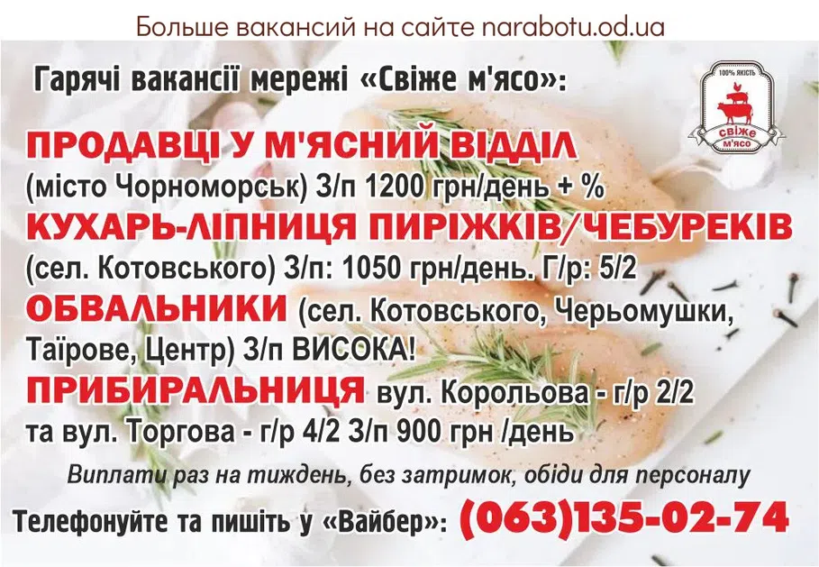 З/п 1200 грн/день + % Гарячі вакансії мережі «Свіже м'ясо»: Виплати 1 раз на тиждень без затримок, обіди для персоналу. Телефонуйте та пишіть у «Вайбер»: …