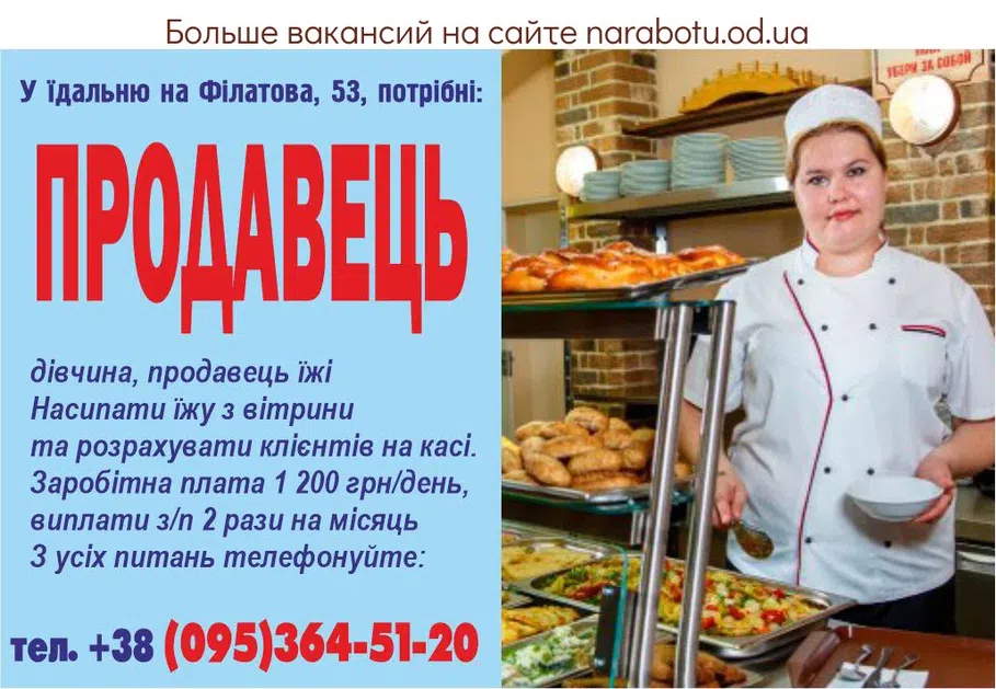 У їдальню на Філатова, 53, потрібна дівчина, продавець їжі. Насипати їжу з вітрини та розрахувати клієнтів на касі. Заробітна плата 1 200 грн/день, виплати з/п …