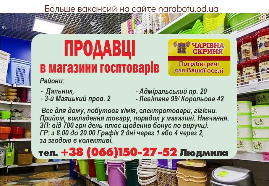 В магазини госптоварів, РАЙОНИ: - Канатна/ М.Арнаутська 37 - Сегедська 13 - пл.Старосінна 1А - пр. Адміральський 20 - Вільямса 73/1 Все для дому, побутова …