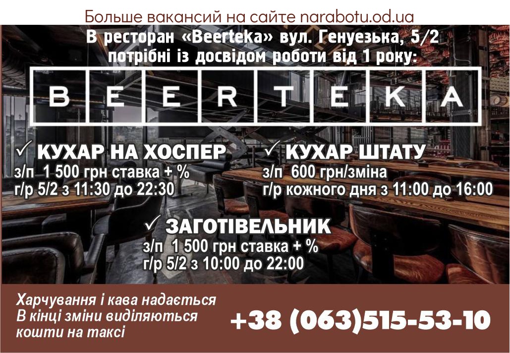 з/п 1 500 грн ставка + % г/р 5/2 з 10:00 до 22:00 В ресторан «Beerteka» вул. Генуезька, 5/2 потрібні із досвідом роботи від 1 …