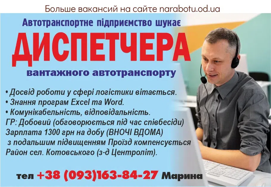 Автотранспортне підприємство шукає диспетчера вантажного автотранспорту • Досвід роботи у сфері логістики вітається. • Знання програм Excel та Word. • Комунікабельність, відповідальність. ГР: Добовий (обговорюється …