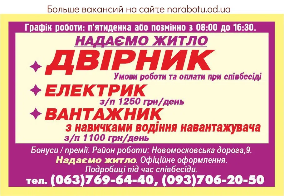умови роботи та оплати при співбесіді НАДАЄМО ЖИТЛО. Район роботи: Новомосковська дорога,9. Офіційне оздоблення. Подробиці під час співбесіди. Повідомте, будь ласка, роботодавцю, що Ви прочитали …
