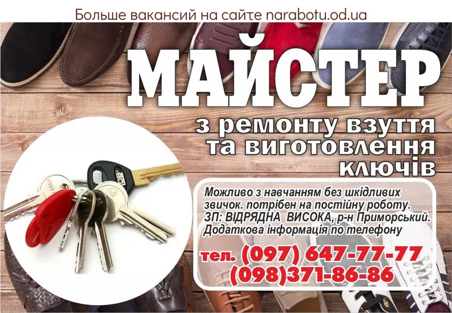Можливо з навчанням без шкідливих звичок. потрібен на постійну роботу. ЗП: ВІДРЯДНА ВИСОКА, р-н Приморський. ЗВЕРТАТИСЬ по телефону Повідомте, будь ласка, роботодавцю, що Ви прочитали …
