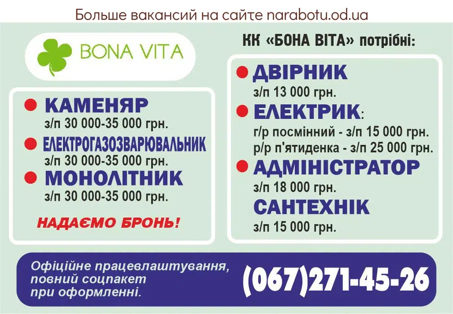 з/п 13 000 грн. потрібен КК «БОНА ВІТА». Офіційний працевлаштування, повний соцпакет при оформленні. Повідомте, будь ласка, роботодавцю, що Ви прочитали вакансію на сайті narabotu.od.ua