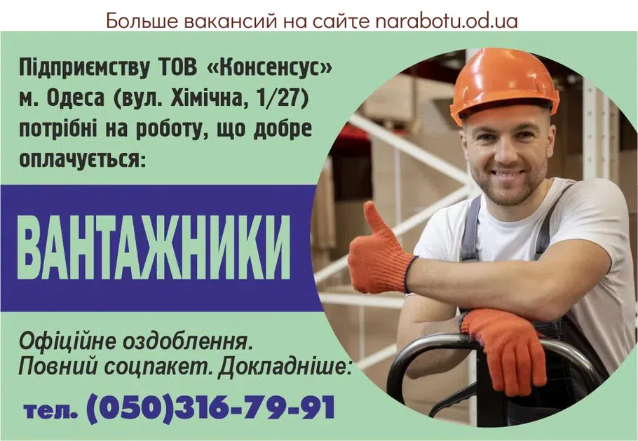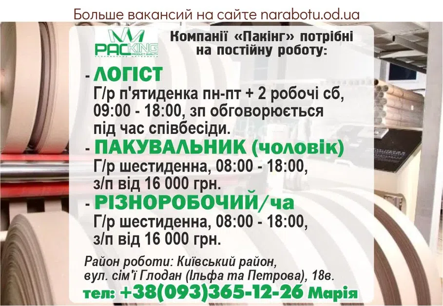 РОБОТА З ПРОЖИВАННЯМ І ОПЛАТОЮ ПРОЇЗДУ! Подробиці по телефону: Повідомте, будь ласка, роботодавцю, що Ви прочитали вакансію на сайті narabotu.od.ua
