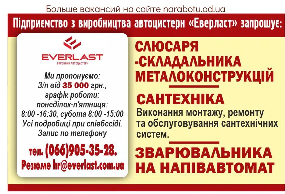 виконання монтажу, ремонту та обслуговування сантехнічних систем. Запрошує підприємство з виробництва автоцистерн «Еверласт». Ми пропонуємо: З/п від 35 000 грн., графік роботи: понеділок-п'ятниця: 8:00 -16:30, …