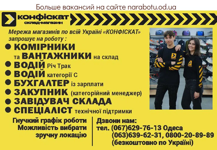 Мережа магазинів по всій Україні «КОНФІСКАТ» запрошує на роботу. Гнучкий графік роботи. Можливість вибрати зручну локацію Дзвони нам: тел. (067)629-76-13, (063)63-96-231 0800-20-89-89 (безкоштовно по всій …
