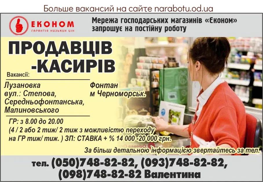 Мережа магазинів «Економ» запрошує на постійну роботу Вакансії: Лузанівка вул.: Степова, Середньофонтанська, Малиновського Фонтон м. Чорноморськ. ГР: з 8.00 до 20.00 (4/ 2 або 2 …