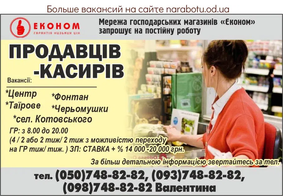 Мережа господарських магазинів «Економ» запрошує на постійну роботу ПРОДАВЦІВ-КАСИРІВ з досвідом роботи Вакансії: *Центр *Таїрове *Фонтан *Черьомушки *сел. Котовського ГР: з 8.00 до 20.00 (4/ …