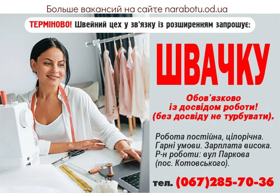 ТЕРМІНОВО! Швейний цех запрошує у зв'язку з розширенням. Обов'язково із досвідом роботи! (без досвіду не турбувати). Робота постійна, цілорічна. Гарні умови. Зарплата висока. Р-н роботи: …