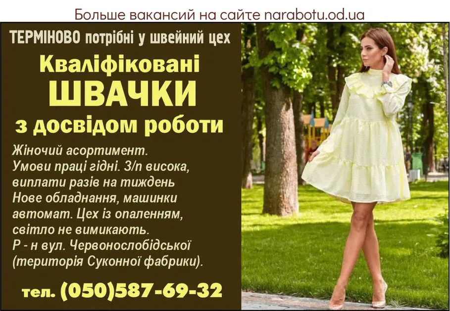 з досвідом роботи, ТЕРМІНОВО потрібні у швейний цех. Жіночий асортимент. Умови праці гідні. З/п висока, виплати разів на тиждень (32 000 - 40 000 грн/міс). …