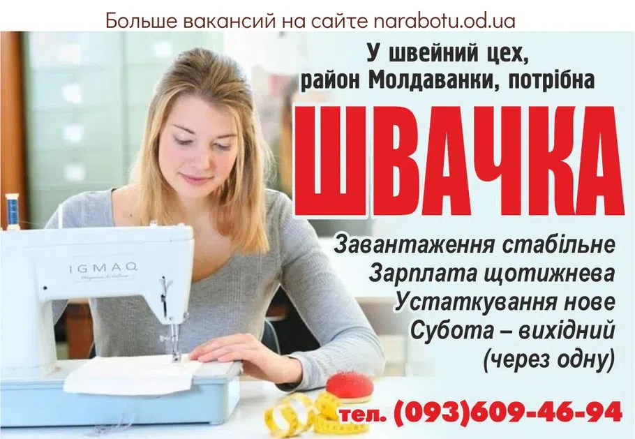 потрібна у швейний цех, район Молдаванки. Завантаження стабільне Зарплата щотижнева Устаткування нове Субота – вихідний (через одну) Повідомте, будь ласка, роботодавцю, що Ви прочитали вакансію …