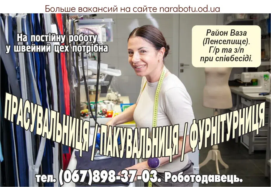 потрібна в швейний цех на Таїрова. Нове встаткування. З/п виплачується щотижня. Подробиці по телефону Повідомте, будь ласка, роботодавцю, що Ви прочитали вакансію на сайті narabotu.od.ua