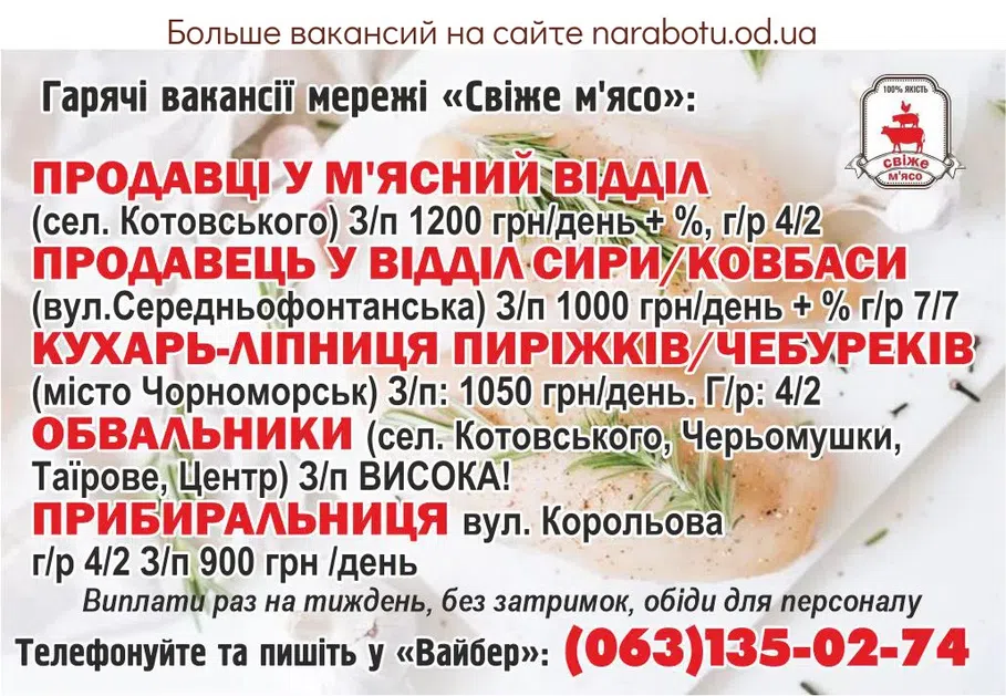 (м. Чорноморськ) З/п: 1050 грн/день Г/р: 4/2Гарячі вакансії мережі «Свіже м'ясо». Виплати 1 раз на тиждень без затримок, обіди для персоналу. Телефонуйте та пишіть у …
