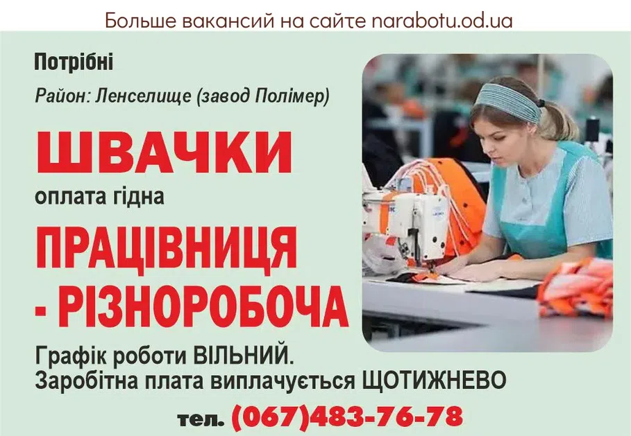 Потрібна на постійну роботу. Оплата гідна. Графік роботи ВІЛЬНИЙ. Заробітна плата виплачується ЩОТИЖНЕВО. Район: Ленселище (завод Полімер) Телефонувати : тел. (067)483-76-78 Повідомте, будь ласка, роботодавцю, …