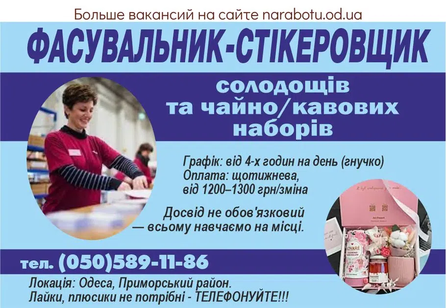 Графік: від 4-х годин на день (гнучко) Оплата: щотижнева, від 1200–1300 грн/зміна Досвід не обов'язковий — всьому навчаємо на місці. Локація: Одеса, Приморський район. Лайки, …