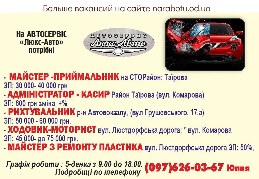 На филиал СТО Люкс Авто Срочно ТРЕБУЕТСЯ : з/п: 45 000- до 75 000 грн. улица Люстдорфская улица Комарова ГР: 5-дневка с 9.00 до 18.00. …