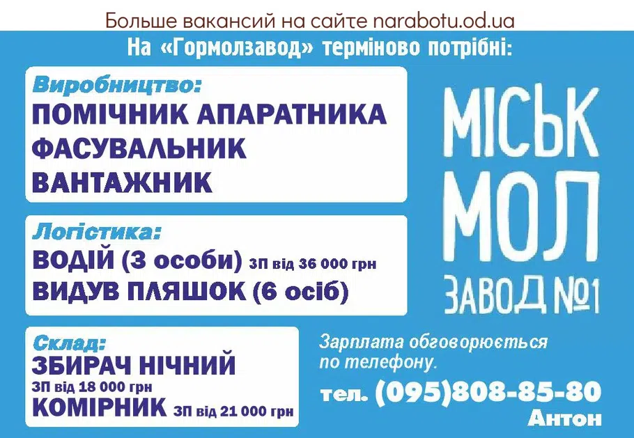 На «Гормолзавод» срочно требуются в отдел логистики. Зарплата от 36 000 грн. Подробности по телефону. тел. тел. (095)808-85-80 Антон Сообщите, пожалуйста, работодателю, что Вы прочитали …