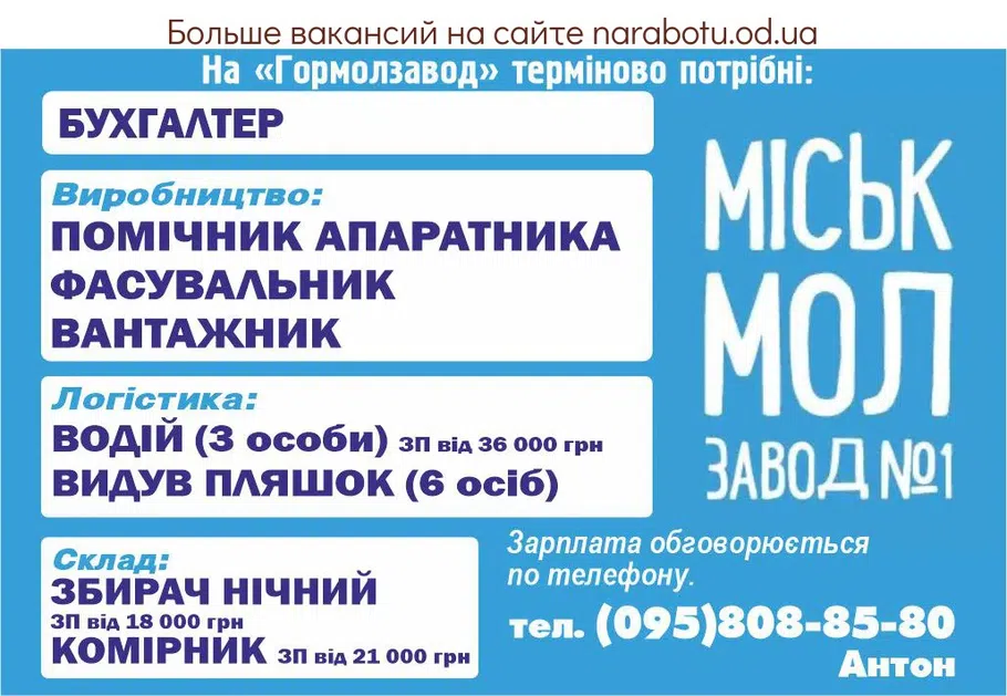 На «Гормолзавод» срочно требуются на производство. Зарплата оговаривается по телефону. Сообщите, пожалуйста, работодателю, что Вы прочитали вакансию на сайте narabotu.od.ua