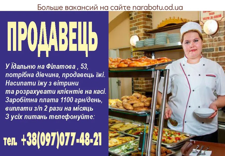 В Столовую на Филатова , 53, требуется девушка, продавец еды Насыпать еду с витрины и рассчитать клиентов на кассе. Заработная плата 1100 грн/день, выплаты з/п …
