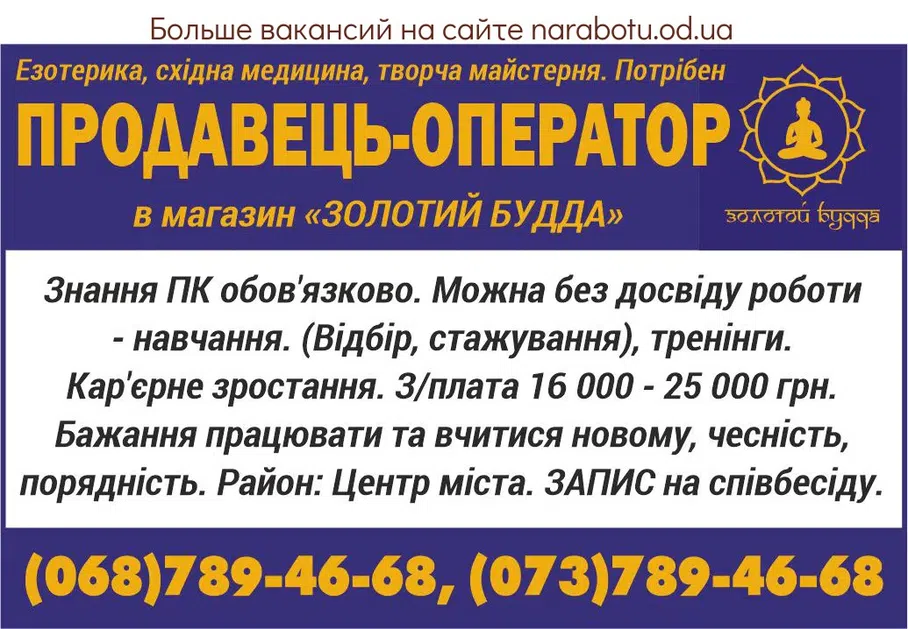 В магазин «ЗОЛОТОЙ БУДДА» Эзотерика, восточная медицина, творческая мастерская. Требуется на постоянную работу. Знание ПК обязательно. Можно без опыта работы – обучение. (отбор, стажировка), тренинги. …