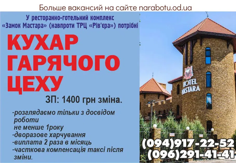 ЗП: 1 400 грн Потрібен ресторанно-готельний комплекс «Замок Мастара» с. Фонтанка, вул. Гоголя 23а/2 -Розглядаємо тільки з досвідом роботи не менше 1року -дворазове харчування -виплата …
