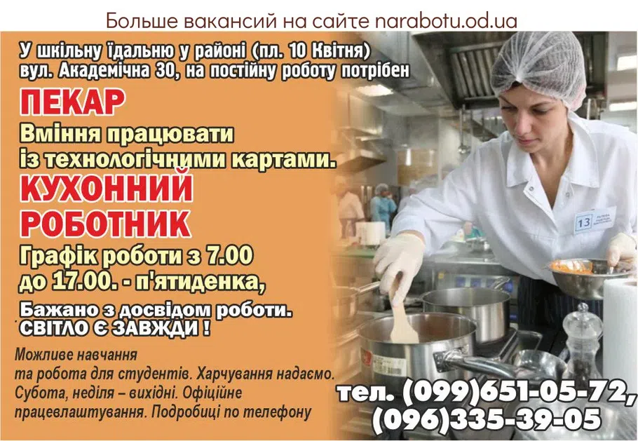 У шкільну їдальню у районі (пл. 10 Квітня) вул. Академічна 30, на постійну роботу потрібно: Вміння працювати із технологічними картами. * Графік роботи з 7.00 …