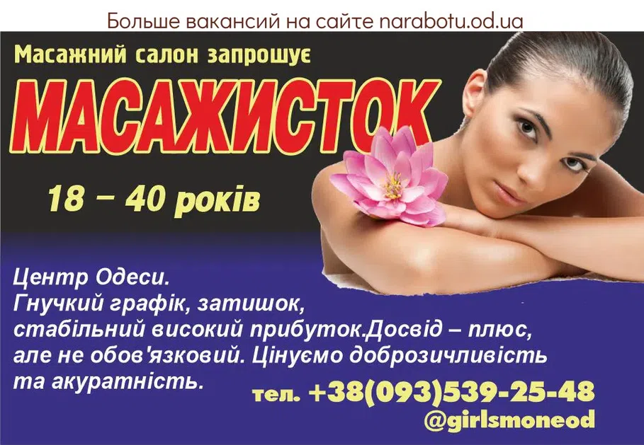 18 – 40 років. Центр Одеси. запрошує масажний салон. Гнучкий графік, затишок, стабільний високий прибуток. Досвід – плюс, але не обов'язковий. Можливість проживання. Цінуємо доброзичливість …