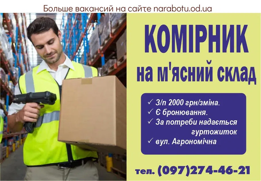 З/п 2000 грн/зміна. Є бронювання. За потреби надається гуртожиток вул. Агрономічна Повідомте, будь ласка, роботодавцю, що Ви прочитали вакансію на сайті narabotu.od.ua